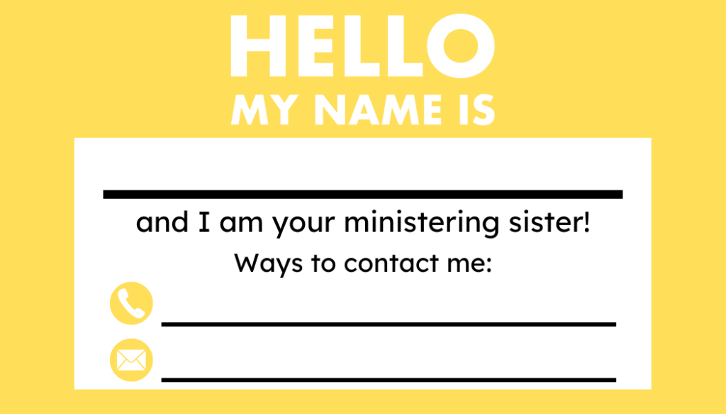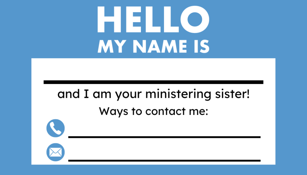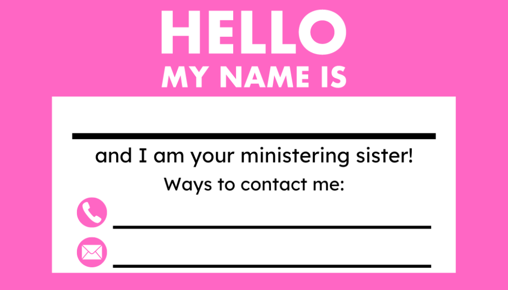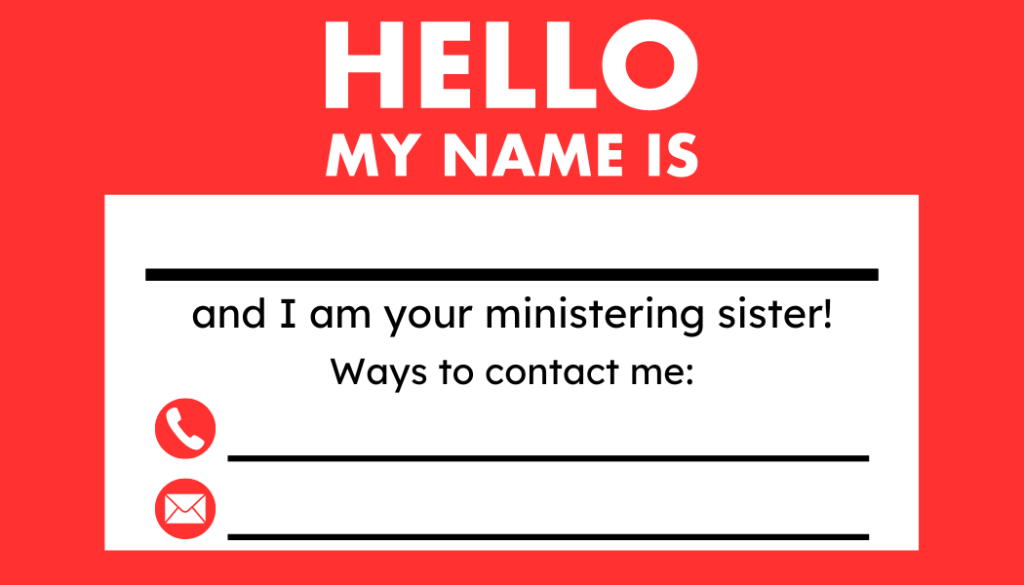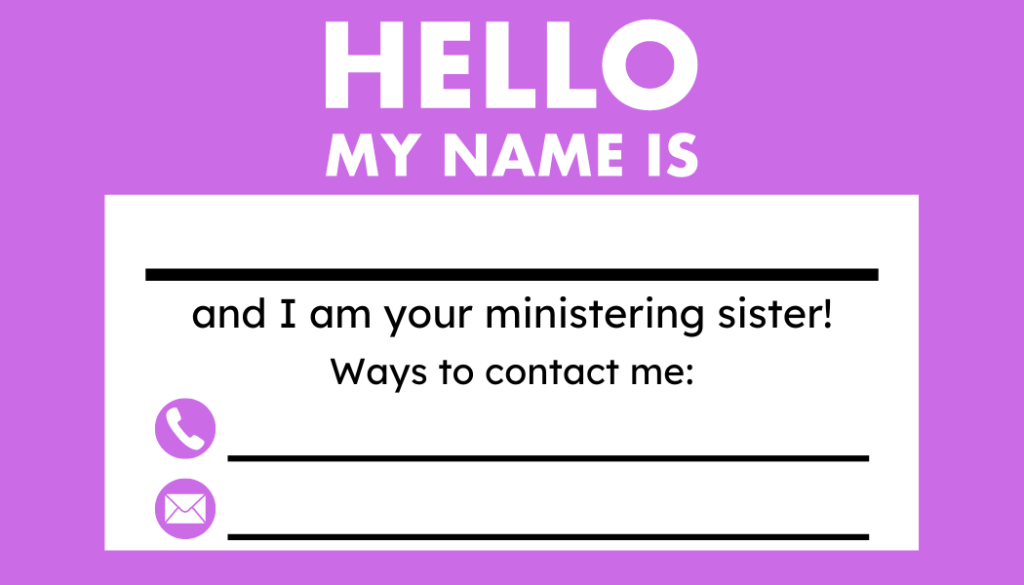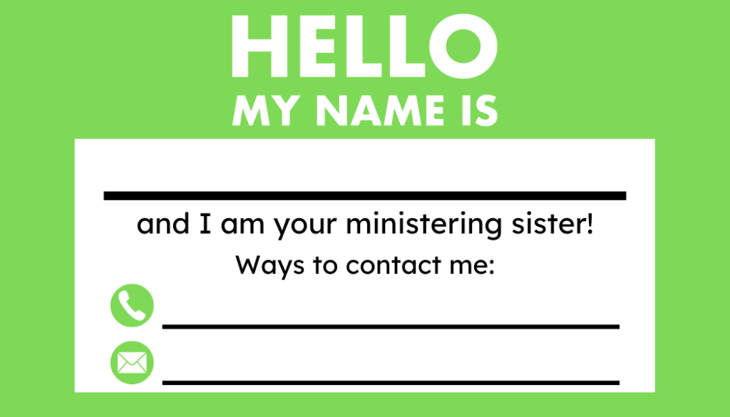 Make contact with those to whom you have been assigned to minister. This can be done in a variety of ways. Reach out to them in person; by phone, text message, or social media; or even with a letter. – What is Ministering?
