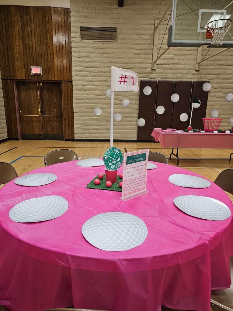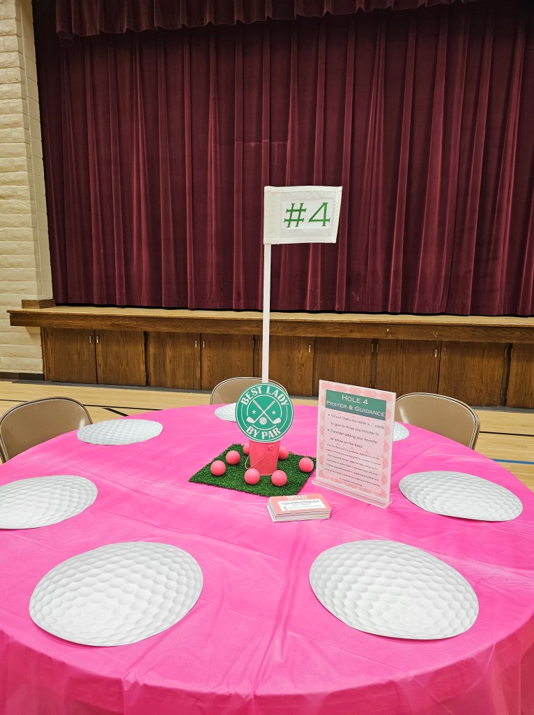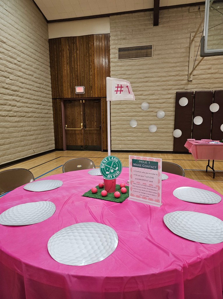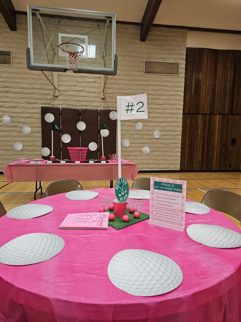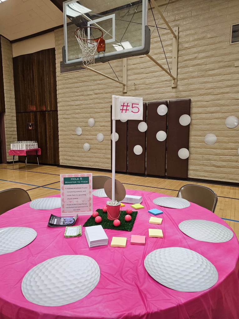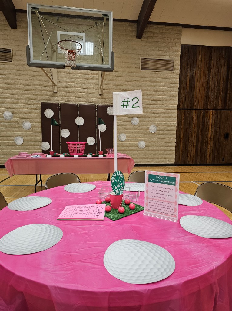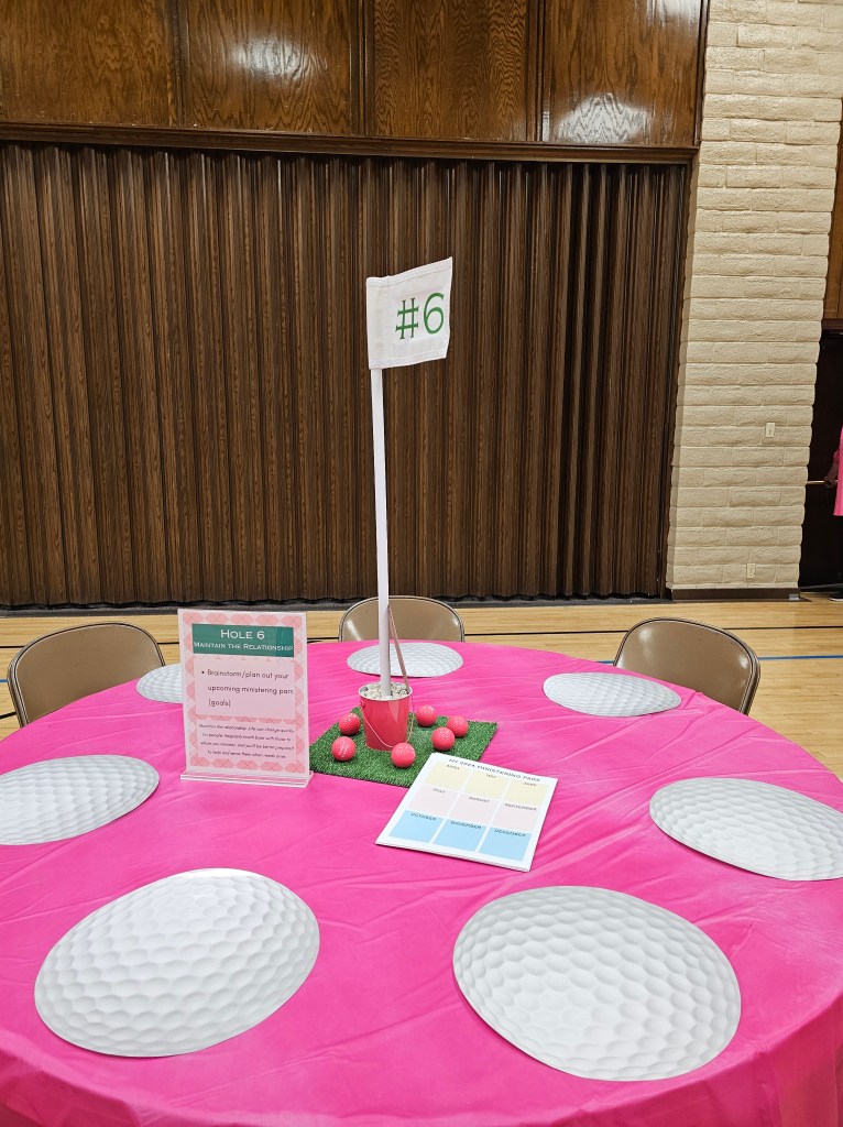 Committed to the theme the moment participants walk in, participants were greeted by a caddy (dad in this case), and provided a golf ball themed bag with a printout on the front listing out each hole/table/activity, along with a golf putter pen they could use to cross out the holes they visited/completed. Not only were the bags, printout, and pens adorable and on theme, but it made it easier for participants to carry around and take home their print-outs, keepsakes, and take-homes from the event, plus it helped participants keep track of where they were on the ministering greens!