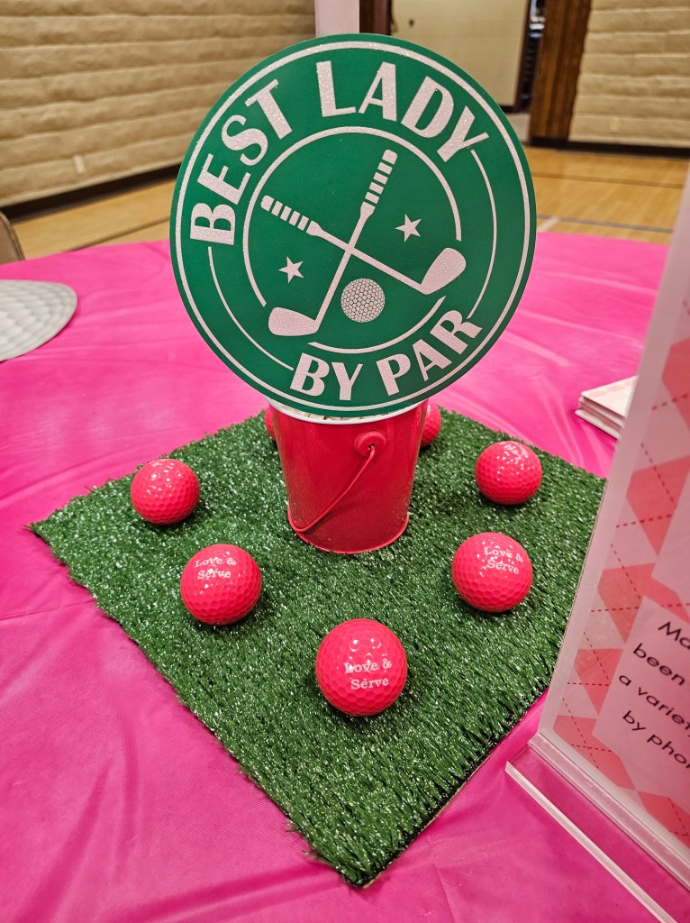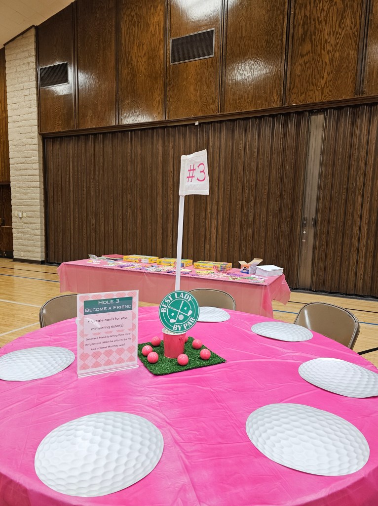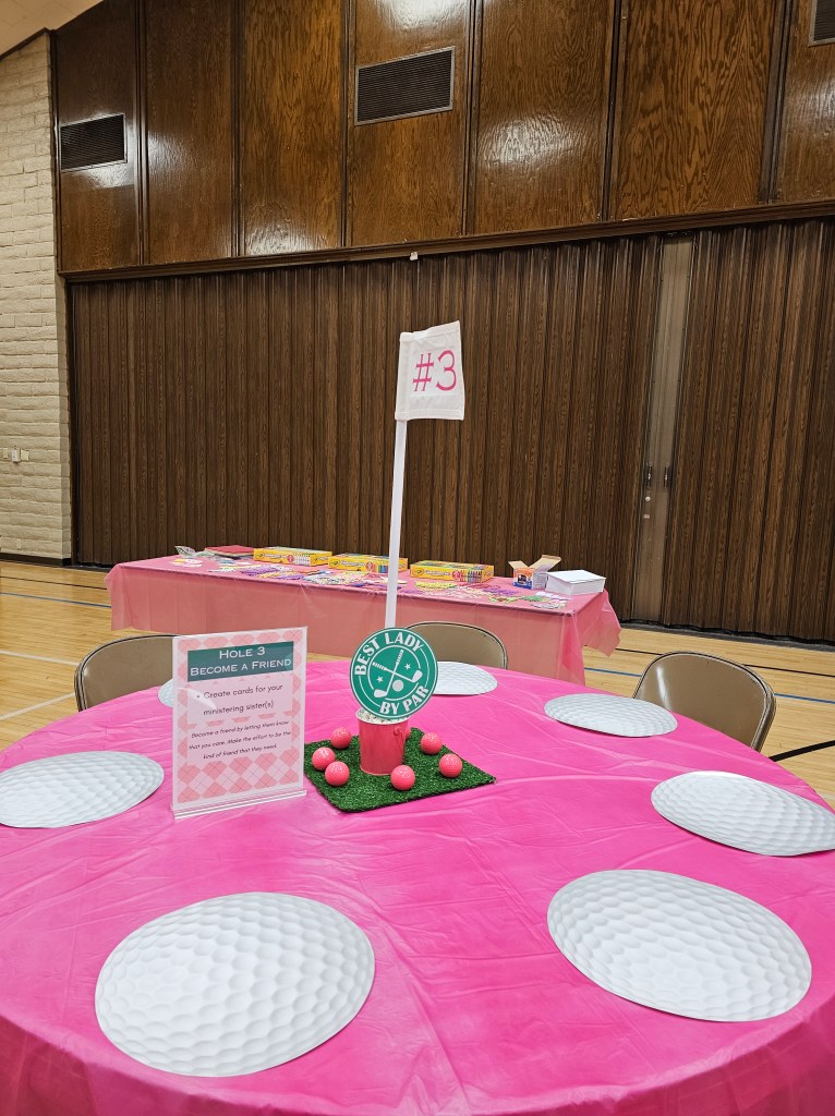 My mom’s Relief Society (church ladies 18+ organization) had been wanting to do an activity related to ministering (in our church you’re assigned fellow ladies to minister to–care for, help, look out for, befriend, etc.), and somehow between finding the church’s article on What is Ministering?, the fact the PGA Masters Tournament takes place in April, and our family’s love of mini golf, my mom had the idea of combining a golf “on par” theme, with ministering. The event, Are you on PAR with your ministering?, provided ladies a chance to get together and find out exactly who it is they’re assigned to minister to, and then take part in different activities (6 different holes) to motivate and prepare them to minister to their fellow Relief Society ladies. Each participant left with a reassured knowledge of who they’re ministering to, and materials to aide them in their ministering (or at the very least to make it cuter/more fun)!