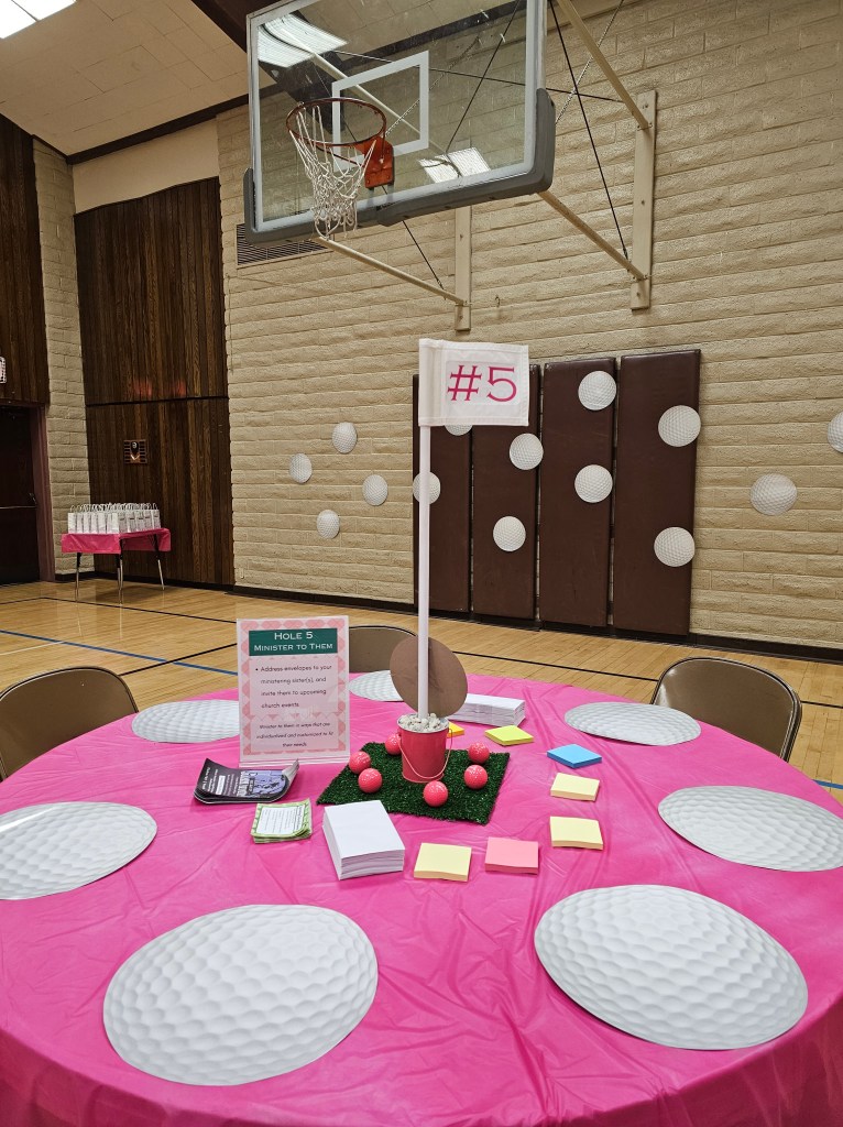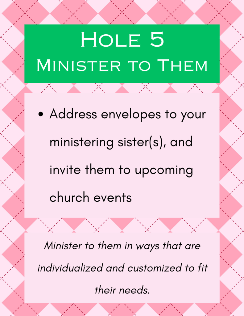 At Hole 5, Minister to Them, we had printed out flyers of upcoming church events, such as our Stake’s Women’s Conference, Youth Camp Fundraiser, and more, along with envelopes and post-it notes for participants to put together and either personally give or mail to the ladies they minister to, in order to invite them to upcoming activities and events. By participants reaching out to the ladies they minister to, it’s a continual effort to invite and include the ladies they minister to.