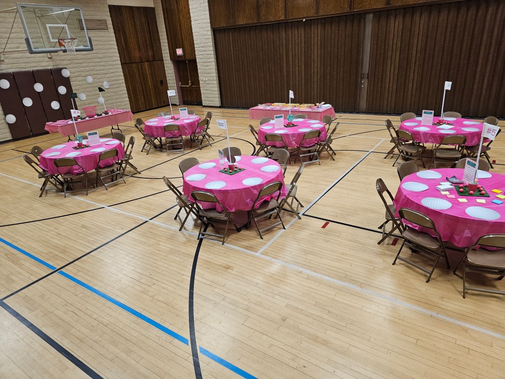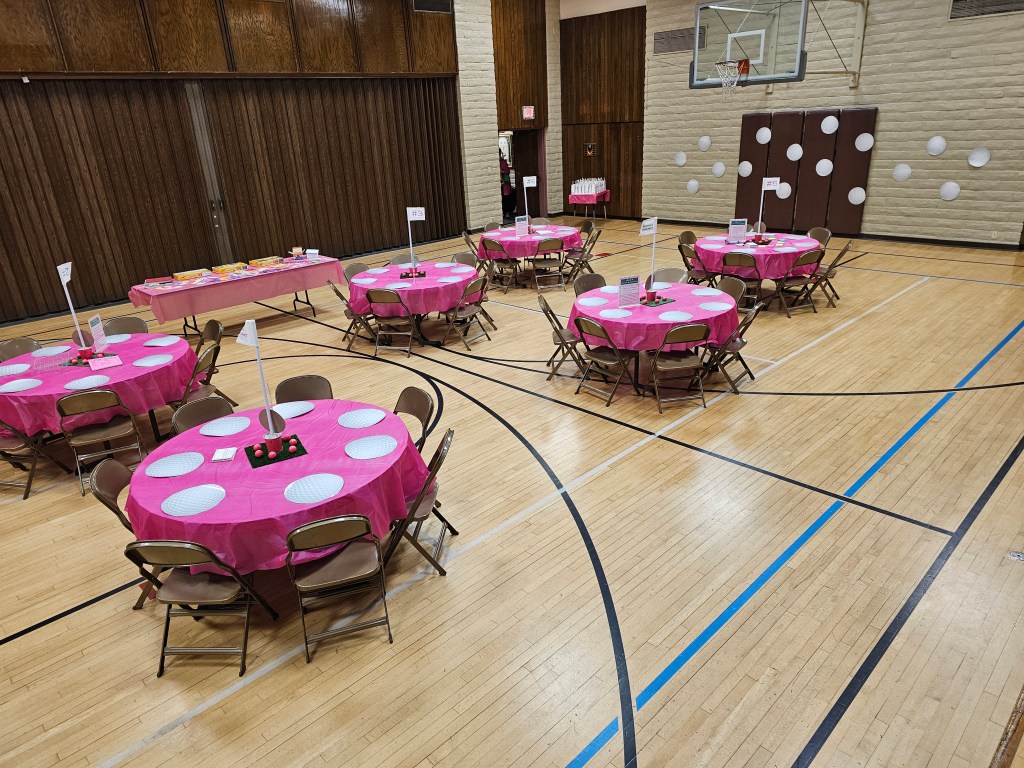 - Cricut Cutting Machine, Cricut iron on, Cricut Auto Press (totally optional, but I used my Cricut to cut out pink and green iron on material denoting each hole/table number, as well as summary of that hole/table’s goal/theme so participants knew which hole/table/activity they were at)