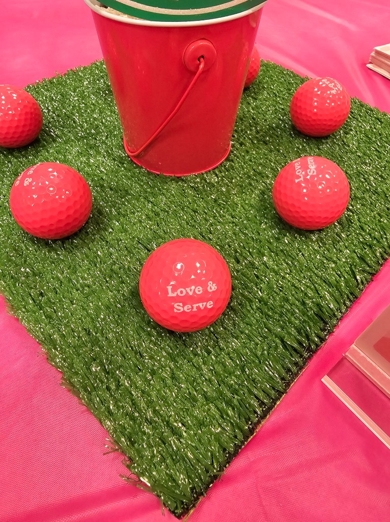 - Customized golf balls (totally optional to get customized golf balls, you can get any fun colored golf balls to add for fun to your tables, but we had customized ones that read “Love & Serve” and each participant took one home at the end of the night, I’ve linked the company we used)