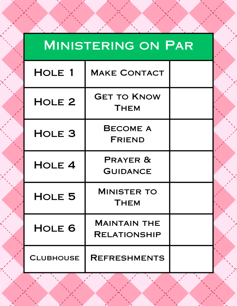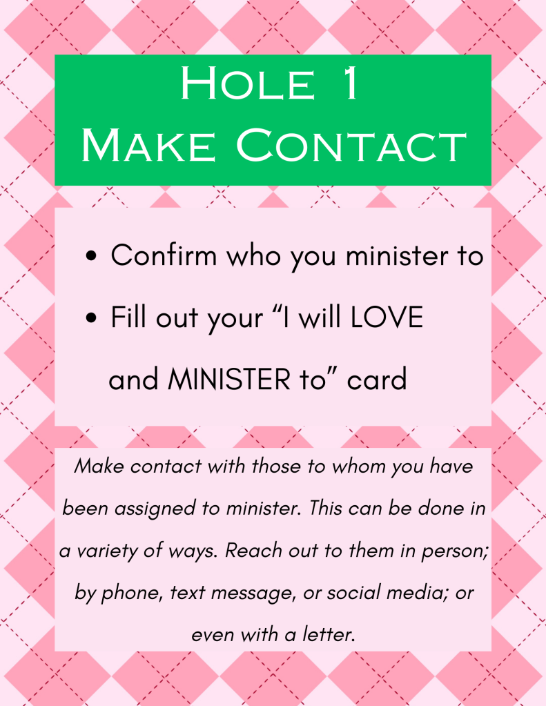 At Hole 1, Make Contact, participants found out/reconfirmed who their ministering sisters are (who they minister to) and who they report to. Additionally, participants at this hole, filled out a little card with this new/reconfirmed information for them to take home and keep as a handy reminder!