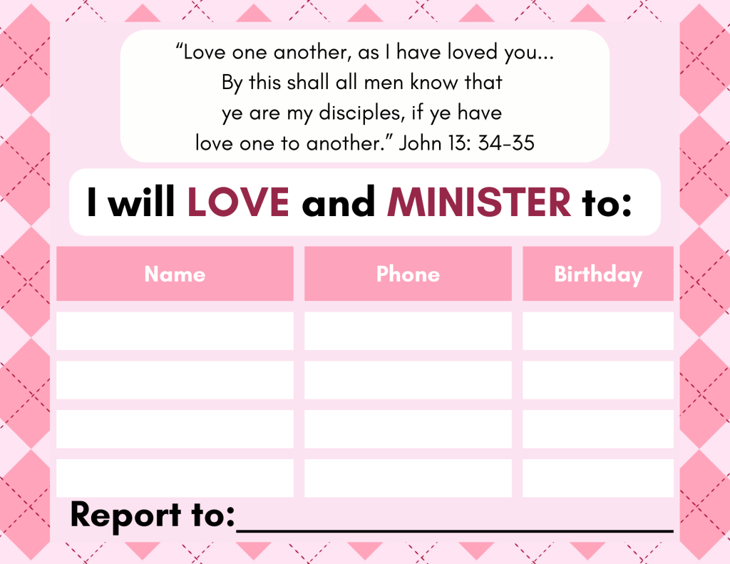 - Ministering Assignment Cards (a bunch printed and cut out at the table for participants to fill out)
