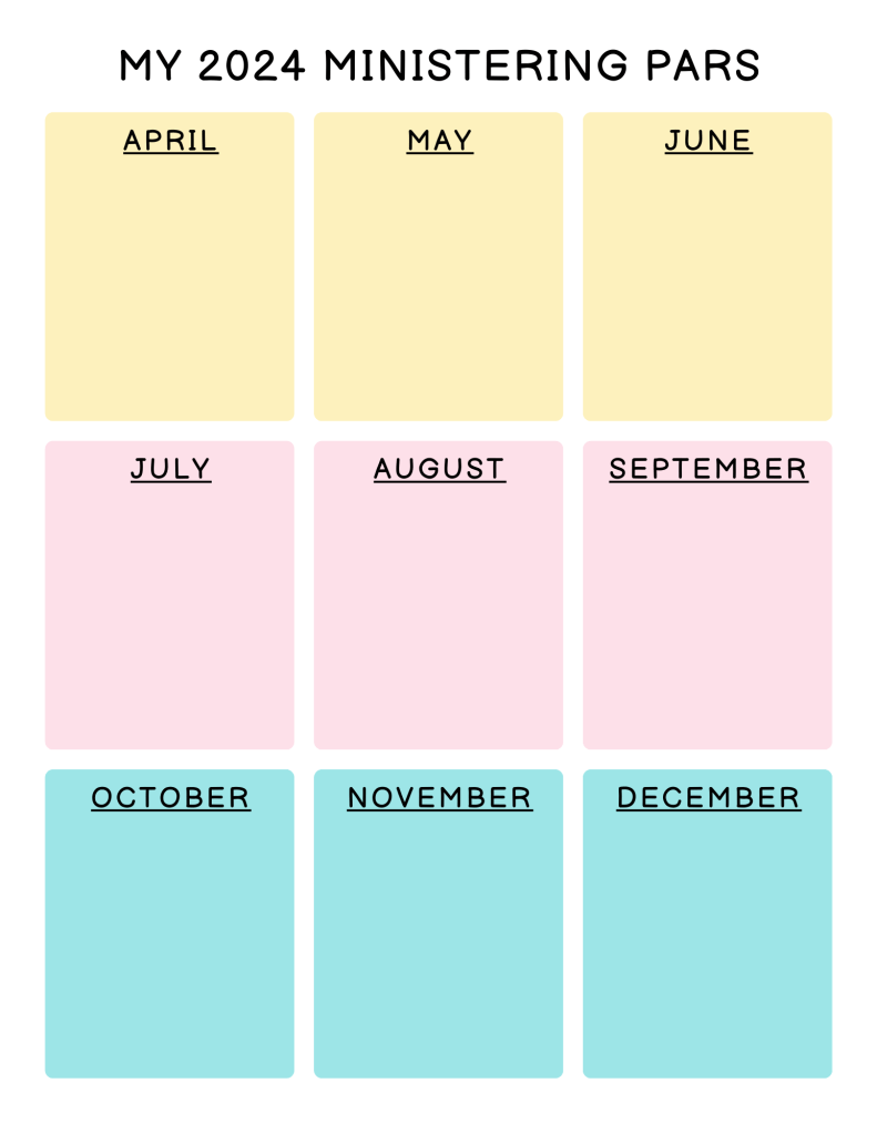 - My 2024 Ministering Pars Printouts (printed out for participants to fill out and keep to remind themselves throughout the year)