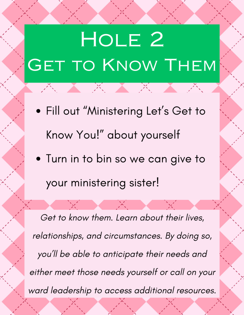 At Hole 2, Get to Know Them, participants filled out a “Ministering Let’s Get to Know You!” paper all about themselves, and then turned them into a bin on the table. Then at a later date, the Relief Society presidency helped get those filled out papers to the Relief Society lady (sister) that is assigned to minister to them. By filling out a “Ministering Let’s Get to Know You!” paper, participants helped those that are ministering/supposed to be ministering to them, get to know them better!