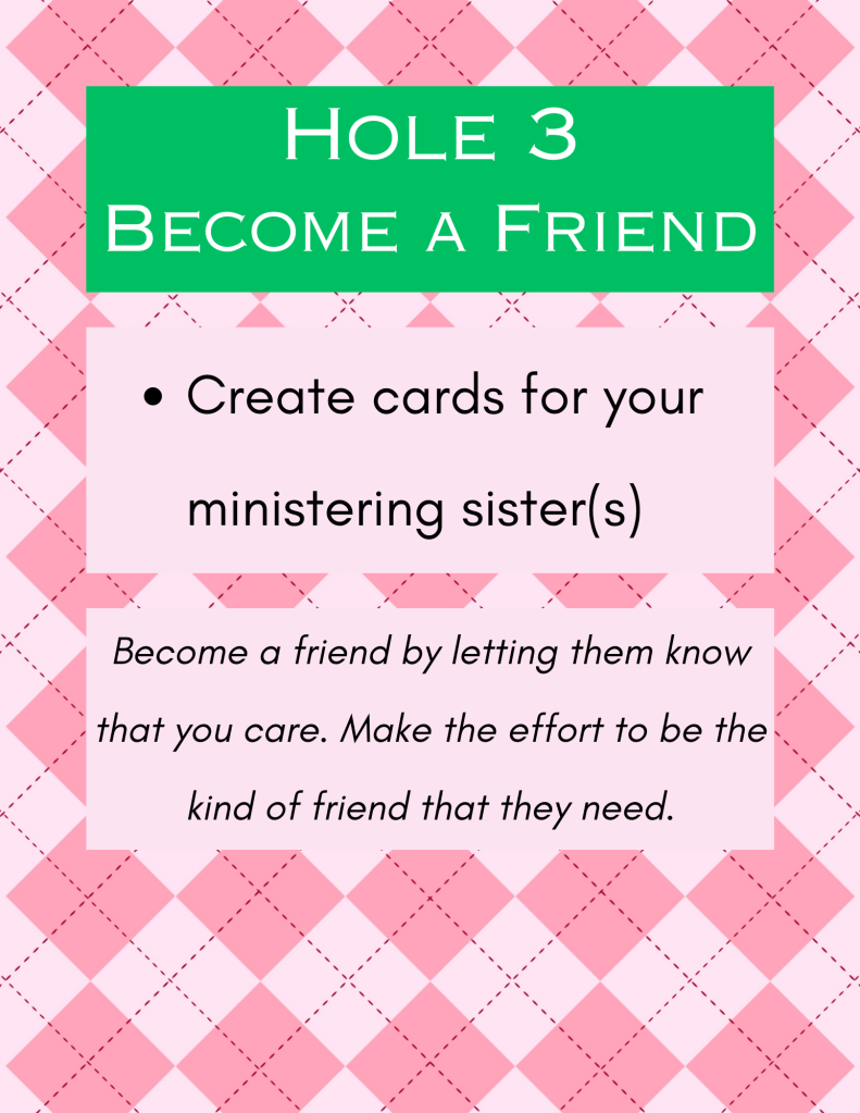 At Hole 3, Become a Friend, participants were invited to create cards for the ladies they minister to, with the intention of starting/continuing their befriending them. Some card ideas include birthday, thinking of you, missing you, just saying hi, and more. The goal of this hole was for participants to be able to make cards and have them ready to hand personally to the ladies they minister to, or address and mail, or we offered to stamp and mail cards for participants too–whatever worked best for participants to actively work on befriending those they minister to.