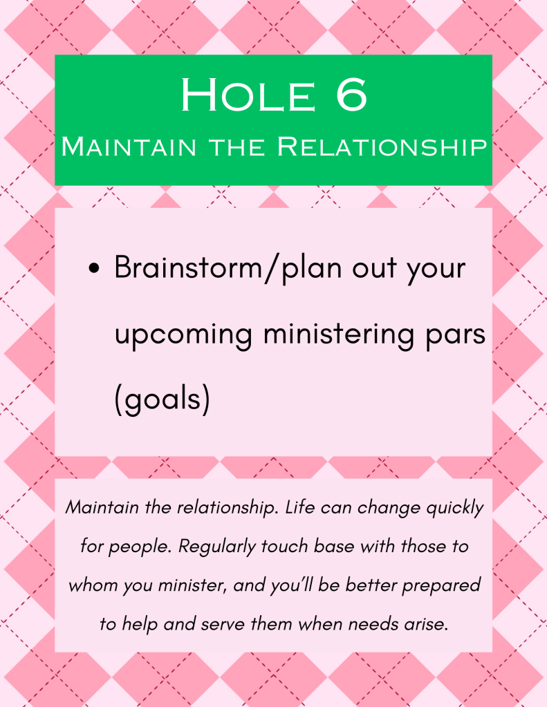 At Hole 6, Maintain the Relationship, participants were provided a year at a glance calendar (the remaining moths in the year, May to December), to set goals/pars for themselves to maintain the relationship with the ladies they minister to. For example, participants could set goals to call those they minister to each week, get together for a meal every other month, gift a little treat, etc., and then plan them out on the provided calendar. This Hole 6, was all about maintaining and keeping up the momentum that was started or continued at this event.